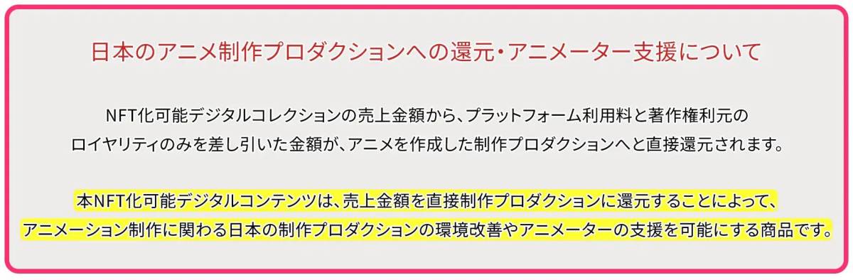 還元されたロイヤリティはDigitelierの他商品同様、制作会社の環境改善やアニメーターの支援などに使用される予定です。購入が制作会社、ひいてはアニメ業界の支援につながるとしています。