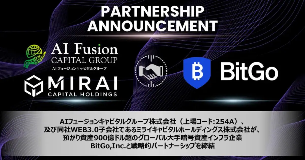 AIフュージョンキャピタルグループ株式会社は、完全子会社でWEB3.0事業を統括するミライキャピタルホールディングスとともに、BitGoとの戦略的パートナーシップを締結したと発表しました。