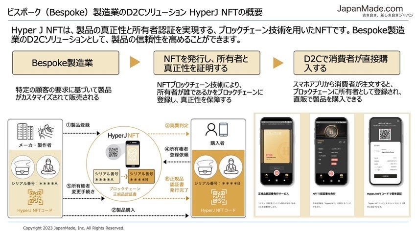 M&Aや知財DD支援「リーガルテックVDR」、特許検索プラットフォーム「Tokkyo.Ai」、ブロックチェーン基盤の電子契約プラットフォーム「Keiyaku SaaS」、法令判例検索サービス「Legal Search」、ブロックチェーン真贋判定システム「HyperJ.ai」といった次世代DX(デジタルトランスフォーメーション)サービスを展開するリーガルテック株式会社(本社:東京都港区、代表取締役社長 佐々木 隆仁)は、子会社のJAPAN MADE事務局株式会社(以下、JAPAN MADE社)を通じ、5月11日よりビスポーク(Bespoke)製造業のD2Cソリューション HyperJ NFTサービスを開始致します。