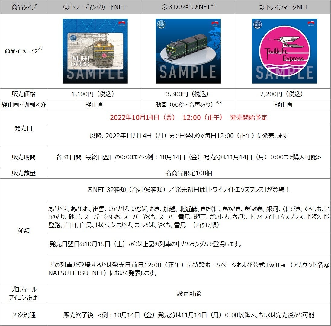 発売初日は、2015年に惜しまれつつも運行を終了した憧れの寝台特急「トワイライトエクスプレス」が登場いたします。以降、どの列車のNFTが発売されるかは、発売前日の12時(正午)に特設ホームページまたは公式Twitter(@NATSUTETSU_NFT)において発表されます。