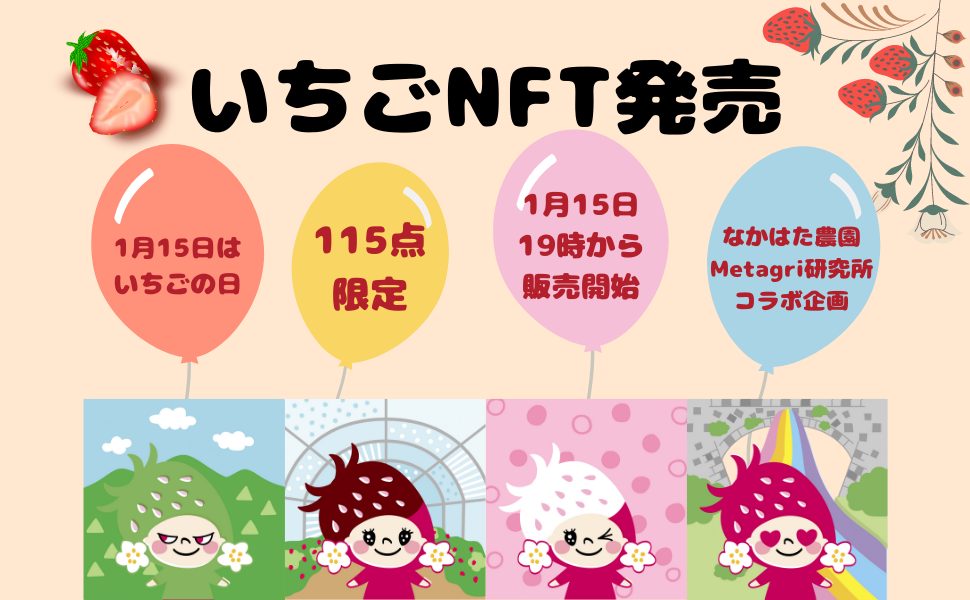 農業ブランディングサービスを展開する「株式会社農情人(本社:千葉県船橋市、代表取締役:甲斐雄一郎)」が運営する農業支援組織「Metagri研究所」は、なかはた農園と共同で115点限定のNFT『MetagriLabo Ichigo Collection (略称: MLIC)』をいちごの日(1月15日)※に発行いたします。