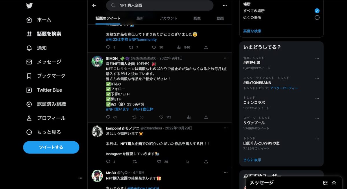 プロモーション活動を行う場合は、TwitterやInstagramなどのSNSを存分に活用しましょう。Twitterには、仮想通貨やNFTの情報収集を目的として、専用のアカウントを持つ人が多く見られます。