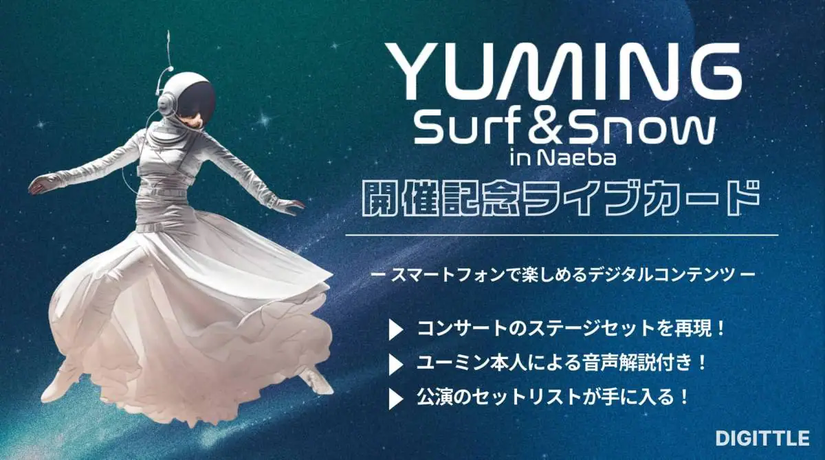 株式会社Digittle(本社:東京都渋⾕区、代表取締役:韮澤 真⼈、以下当社)は、2024年2⽉5⽇(⽉)より開催される松任⾕由実さんのコンサート「SURF&SNOW in Naeba Vol.44」にて、コンサートへの参加記念商品として、ライブカード(NFT)の販売を⾏います。