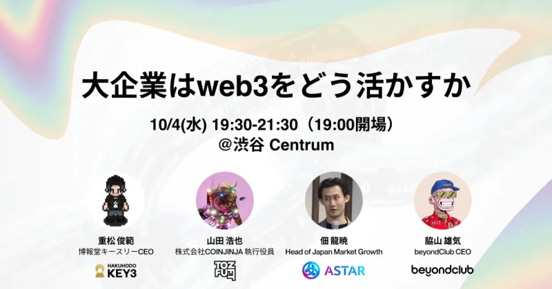 beyondClubは、10月4日に渋谷Centrumにて「ブランド・大企業はNFTやweb3をどう活用するべきか」というイベントをtofuNFT、博報堂キースリー、Astar Networkと共同開催いたします。