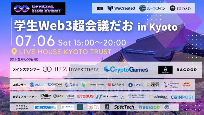 この記事では、「WeCreate3」、日本初大学発LLC型DAO「iU DAO」、推し活×地方創生Web3スタートアップ「ルーラコイン」主催による「学生Web3超会議だお in Kyoto」の開催が決定が発表されました。以下、プレスリリース詳細を掲載しております。