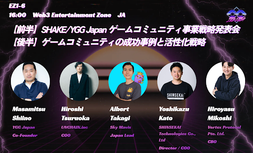 スピーカー:Vortex Protocol CBO 己越 千清氏/Axie Infinity アジア地域アンバサダー アルちゃん氏/株式会社SHINSEKAI Technologies 取締役COO 加藤 貴一氏