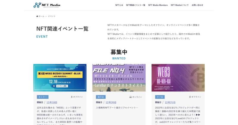 NFT関連イベント一覧ページは、NFT・Web3に関連するイベントの増加を受けて企画・作成されました。すでに現在、NFT・Web3等をテーマにしたイベントを数多く掲載しています。