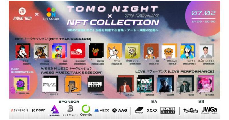 JBW(Japan Blockchain Week)のPick Up Community Events( https://japanblockchainweek.jp/#pickup)として登録されている今回のイベントは、関西最大級の規模でNFTプロジェクト界隈を牽引するNFT COLOR(合同会社 NFT COLOR)様と共同で開催することにより、業界で著名なNFTアーティスト・クリエイター様他、ミュージシャンらにご登壇・ご出演頂けることとなり、プログラム内容も格段にボリュームアップしました。