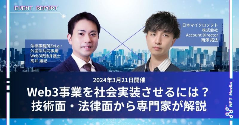 2024年3月21日(木)、法律事務所ZeLo・外国法共同事業(以下、法律事務所ZeLo)と日本マイクロソフト株式会社(以下、日本マイクロソフト)の共催で、オフラインイベント「Web3事業を社会実装させるには?技術面・法律面から専門家が解説」が開催されました。