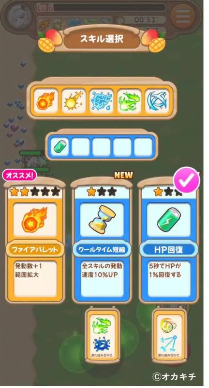 経験値で新スキルやアイテムをランダム獲得。強化を重ねるか進化させるかは選択次第。バリア・竜巻・爆弾・砲台・骨付き肉・ガム等、ランダム要素との組み合わせで戦略が広がります。