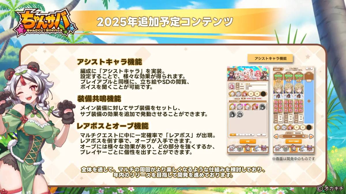 配信開始(4月14日)以降、プレイアブルキャラは14キャラに拡大し、専用装備も順次追加。闘技場は全3回開催。マルチプレイの改善(スタンプ・ルーム機能など)も進行中です。近くシリーズプレイヤー向けのNFT連動コンテンツを追加予定。年内アップデートとして「アシストキャラ機能」「装備共鳴機能」「レアボスとオーブ機能」を予定しています。