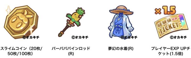 イベントデイリーミッションやマルチクエスト挑戦で「チャンスくじ」を獲得。くじを引くと「スライムコイン」や限定装備、各種ガチャ鍵、経験値チケット等が当たります。累計回数に応じた報酬も用意。獲得した「スライムコイン」は交換所で各種アイテムと交換可能です。