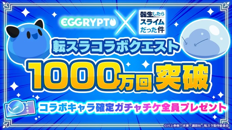 株式会社Kyuzan(本社:東京都渋谷区、代表取締役:髙橋 卓巳、以下「Kyuzan」)が、株式会社GameWith(本社:東京都港区、代表取締役社長:今泉卓也、以下「GameWith」)と共同開発した、アプリで簡単に遊べるNFTゲーム「EGGRYPTO(エグリプト)」において、7月5日(金)より開催している「転生したらスライムだった件」コラボクエストの合計クリア数が1,000万回を突破いたしました。