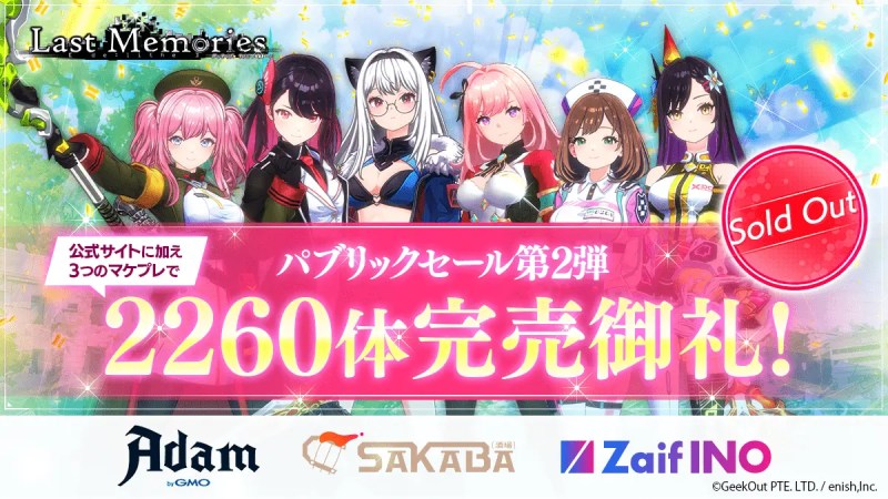 株式会社enish(本社:東京都港区、代表取締役社長:安徳孝平、以下enish)は、「GEEKOUT PTE. LTD.(本社:シンガポール、代表取締役CEO嶋瀬 宏)」と連携し、開発中のモバイルゲームクオリティのブロックチェーンゲーム『De:Lithe Last Memories(ディライズ ラストメモリーズ)』について、5月9日より実施していたパブリックセールにおいて、先日の「公式特設販売サイト」に続き、「Adam byGMO」、「Sakaba」、「Zaif INO」の全販売所で、限定販売したNFTドール2260体が完売したことをお知らせします。
