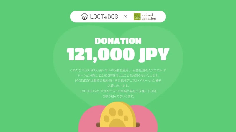 LOOTaDOGでは、ペットのお散歩アプリを開発・運営しており、ゲーム内の機能拡張に加え、データを個人へ紐づかせる事ができるNFT(非代替性トークン)やブロックチェーンを活用しております。これらは、透明性を維持した寄付活動にも非常に高い効果が見込め、今後も積極的な実施を予定しております。