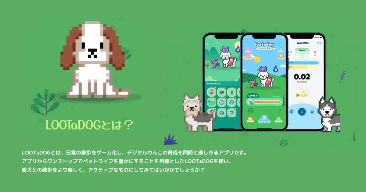 LOOTaDOGは、日々の散歩をゲーム化しながらWeb3わんこの育成を楽しめるアプリで、獲得報酬の一部をペットケア基金に還元する仕組みも備えています。