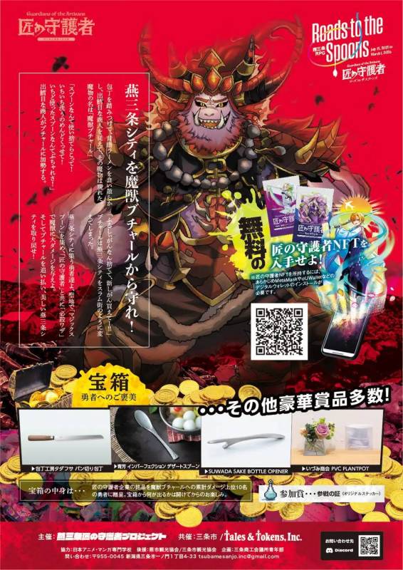 本企画は、NFTを活用した「デジタル三条市民証」としての機能も備えており、参加者は「匠の守護者」を仲間として、燕三条エリアに復活しようとしている「魔獣ブチャール」に立ち向かうストーリーを楽しめます。