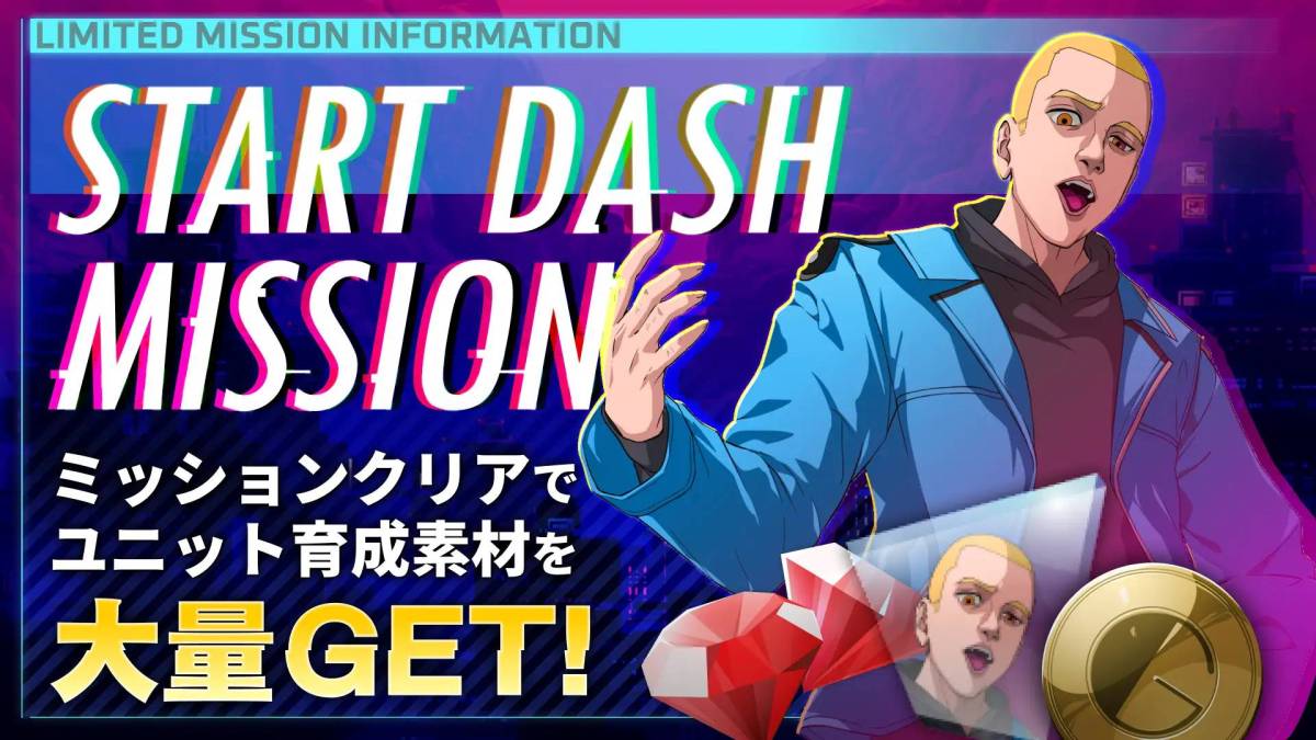 リリース記念として、ゲーム内ではスタートダッシュミッションを開催。チュートリアルで入手できるユニット「ハイマン #08」を育成できるアイテムが配布されるほか、一定の条件を満たすと最大レベル7まで育成可能となります。