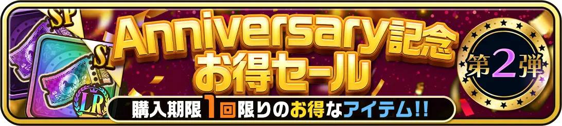 SPガチャチケットLRを含む「Anniversary記念お得パック第二弾」が、購入上限1回限りで販売されます。