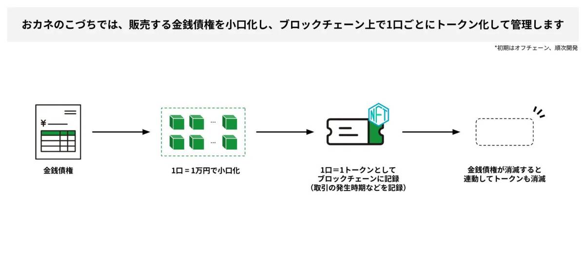 おカネのこづちでは、販売する金銭債権を小口化し、ブロックチェーン上で1口ごとにトークン化して管理します