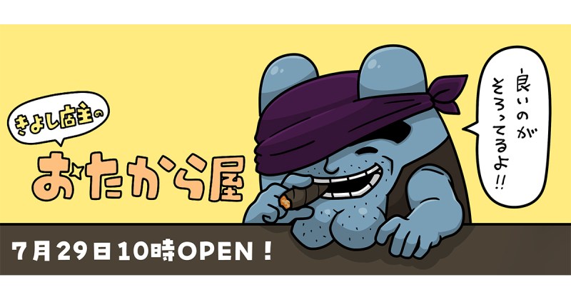 NFTプロジェクト『CNP Jobs』やいつもニコニコ笑顔でハッピーな謎キャラ『きよし』などのIP事業を手掛ける合同会社アビスギルドが、2023年7月29日(土)10時に公式オンラインショップ「きよし店主のおたから屋」をオープンしました。