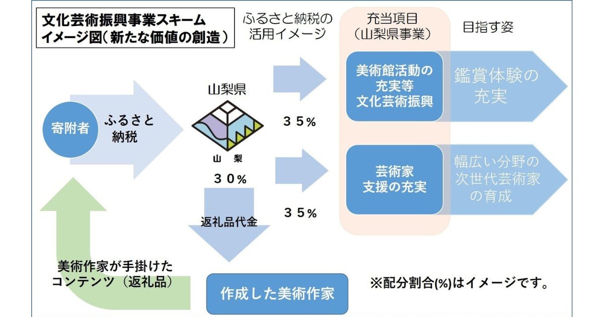 山梨県は、山梨県立美術館が新たな価値の創造拠点となることを目指し、今年6月にビジョンを策定しました。この取り組みの一環として、県の事業に携わった現代美術作家が手掛けるコンテンツをふるさと納税の返礼品とし、その寄附が文化芸術振興及び、幅広い分野の芸術家への支援・育成へと活用されます。