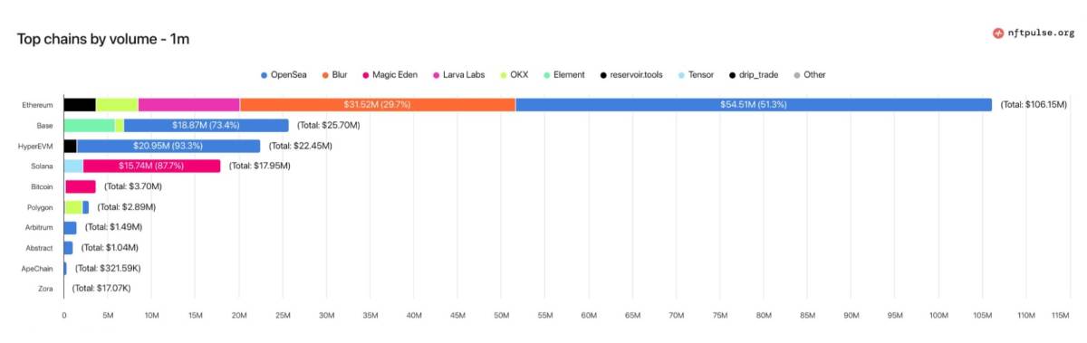 - 直近30日のチェーン別ではイーサリアムが取引高1.062億ドル、ユーザー数はBaseが17.2万人で最多
