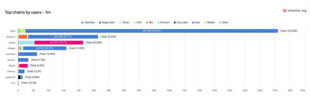 マーケットプレイスでは、全体が冷え込む中でもOpenSeaが取引高・ユーザー数ともに首位を維持しました。BaseやHyperEVMなど伸びたチェーンほどOpenSeaに流れやすく、全体の出来高が落ちた分、取引は分散せず、OpenSeaにまとまりやすい月でした。