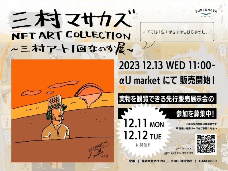 なお、「αU market」にて12月13日から開始するオンライン販売に先駆け、ホリプロがプロデュースするライブハウス「SUPERNOVA KAWASAKI」にてMetal Canvas Artの展示ならびに先行販売会「三村マサカズ NFT ART COLLECTION 〜三村アート1回なのか展〜」を12月11日・12日に実施します。 三村さんの個性的なアート作品が、デジタルとリアルの両方でお楽しみいただける、またとない機会です。