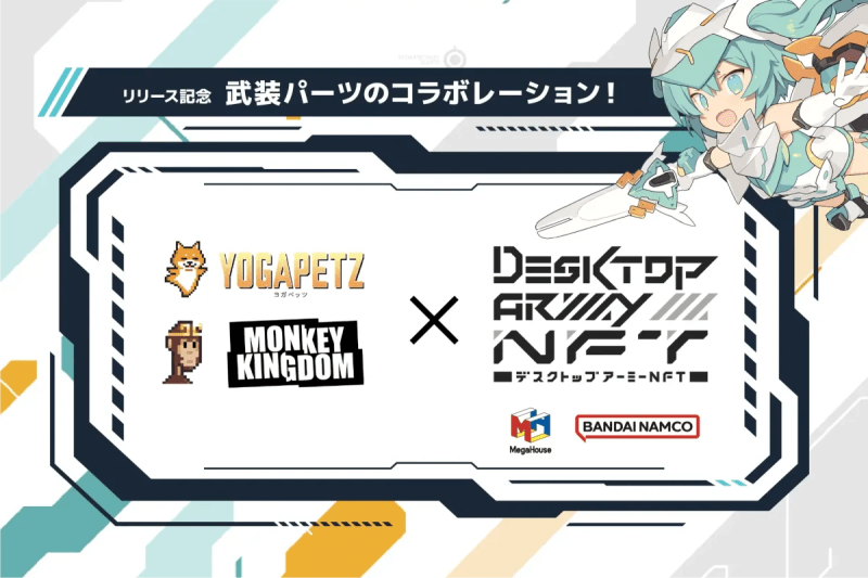 この記事では、株式会社UPBONDと株式会社メガハウスより「デスクトップアーミーNFT」リリース記念に海外有名NFTプロジェクトとの武装パーツのコラボレーションが発表されました。以下、プレスリリース詳細を掲載しております。