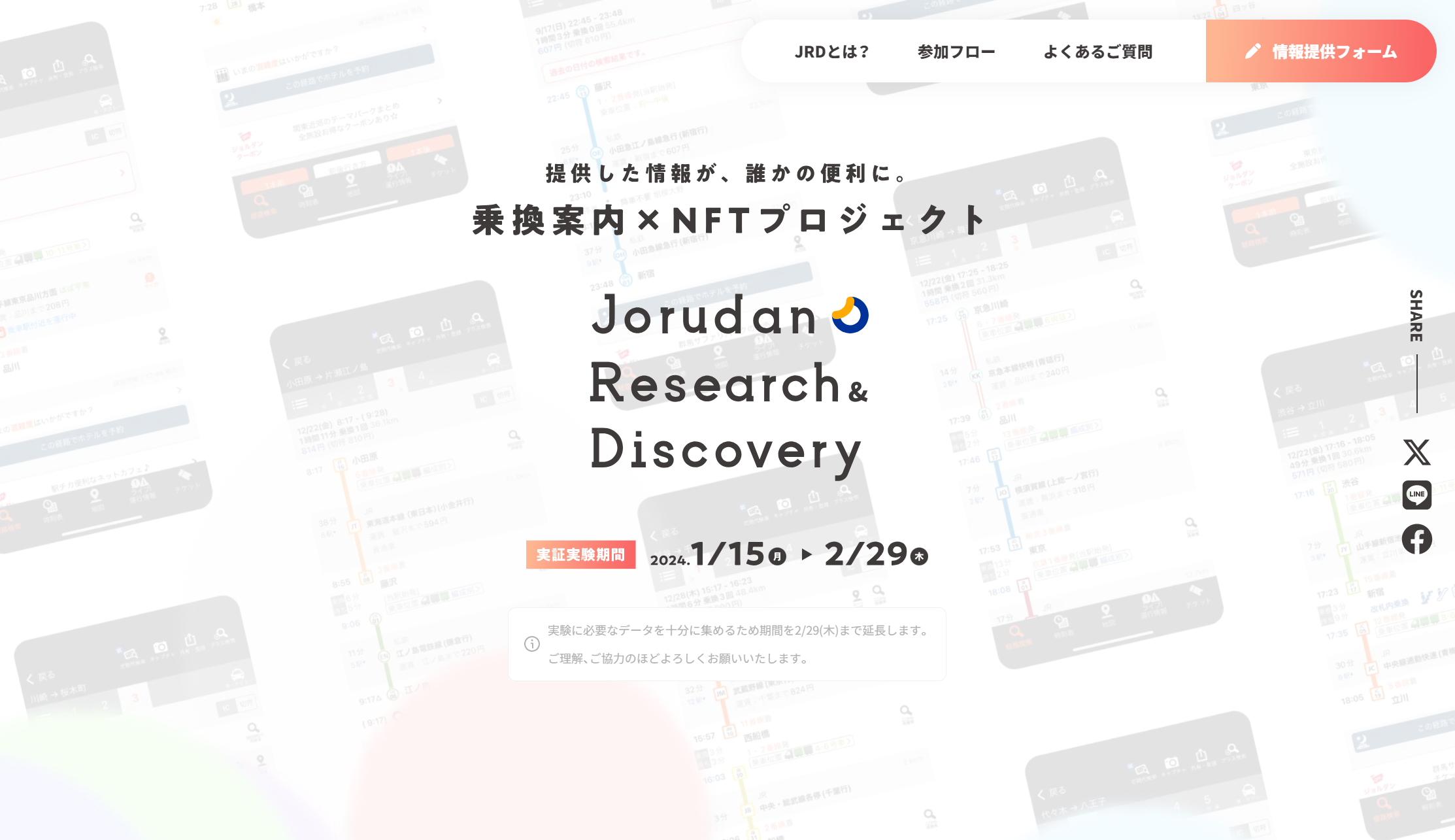 「Jorudan Research & Discovery」は、例えば電車を利用する人々が待ち時間などを利用して調査を行った駅の情報や、訪れた先で発見したレストランやカフェ、観光スポットなどの情報をジョルダンに提供し、そのインセンティブとしてユーザーがNFT(※1)を抽選で生成できる、参加報酬型のプロジェクトです。