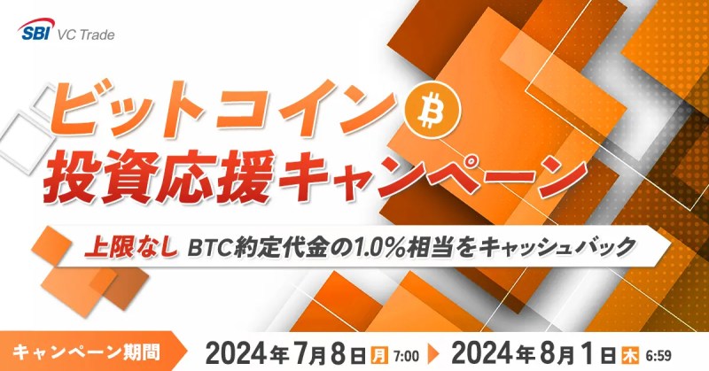 SBI VCトレード株式会社(本社:東京都港区、代表取締役社長:近藤 智彦、以下「当社」)は、2024年7月8日(月)より、「ビットコイン投資応援キャンペーン ~【上限なし】BTC約定代金の1.0%相当をキャッシュバック~」を実施することをお知らせいたします。