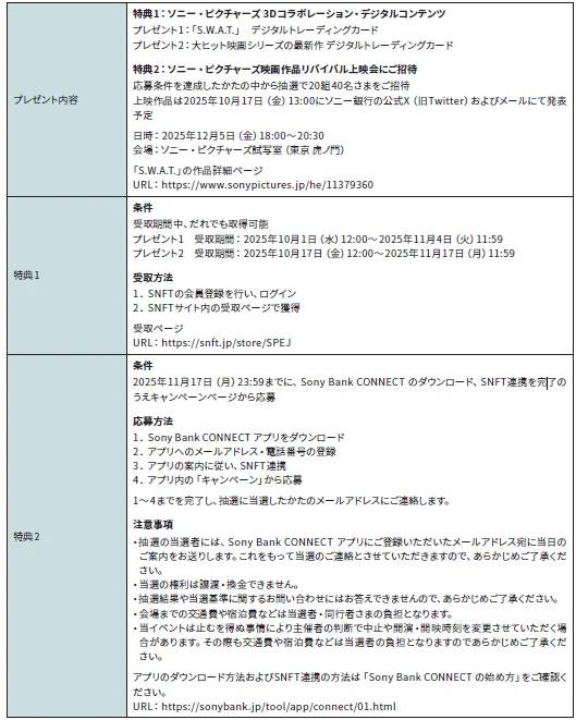 2つ目は、対象期間中にSony Bank CONNECTのダウンロードおよびSNFT連携など所定の条件を満たした方の中から、抽選で20組40名を東京・虎ノ門のソニー・ピクチャーズ試写室でのリバイバル上映会に招待するものです。対象作品は、2025年10月17日(金)13:00にソニー銀行の公式X(旧Twitter)およびメールにて発表予定とされています。