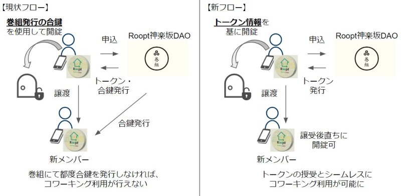導入先はDAO(※2)型シェアハウス「Roopt(ループト)神楽坂DAO」(※3)。コワーキングルームのある母屋への入退室を「Roopt NFT Kagurazaka」の保有有無により管理します。シェアハウスのセキュリティとDAOメンバーの利便性を向上させるとともに、DAO運営の領域拡大と円滑化を目指していきます。(設置は2023年2月中旬予定)
