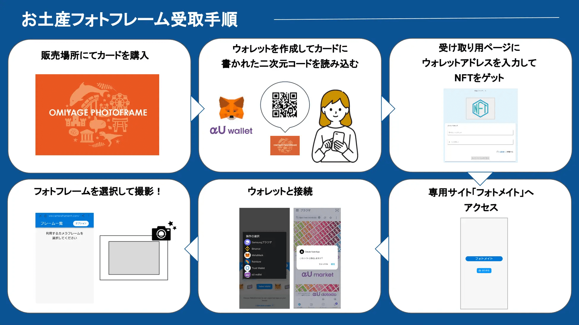 おみやげフォトフレームは、スマートフォンでフォトフレーム付きの写真撮影ができる機能です。おみやげフォトフレームには、NFT技術が使われており、特定のNFTを持っていると専用のwebアプリ「フォトメイト」にて使用することが可能です。