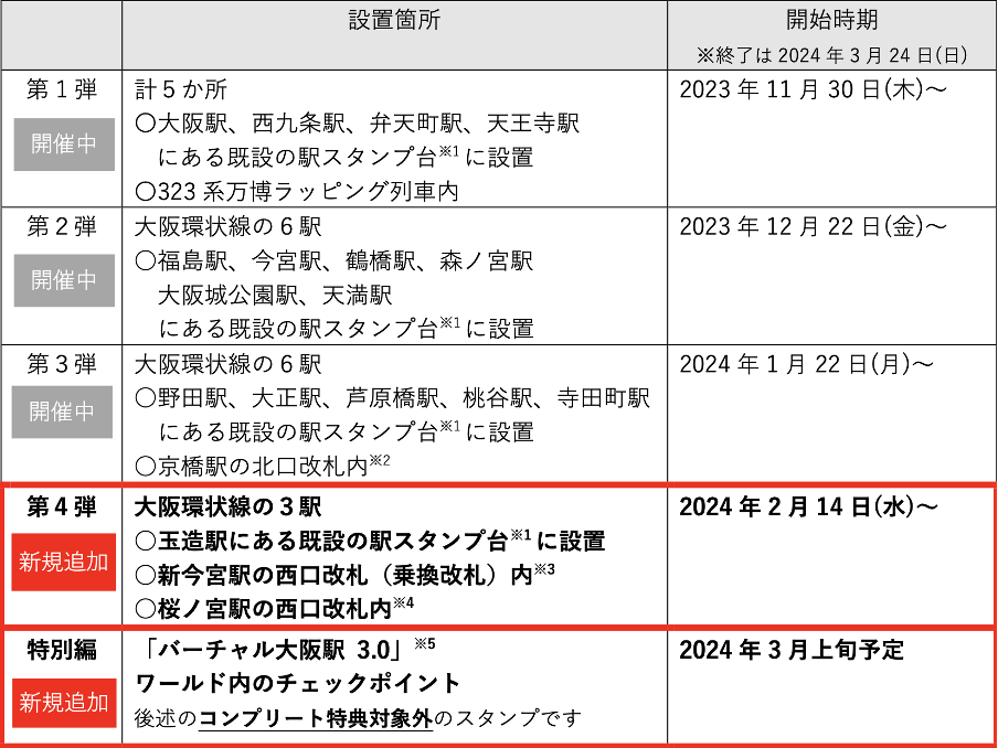 「EXPO 2025 デジタルウォレット」にて「大阪環状線NFT駅スタンプラリー」を2023年11月30日(木)より実施していますが、2024年2月14日(水)より第4弾を開始し、新たに3駅のNFT駅スタンプを追加し、スタンプラリー対象の全20箇所が出揃います。これにより、対象箇所を全て集めた方に配布される特典「コンプリートNFT駅スタンプ」が獲得できるようになるほか、さらに追加特典として、特別な賞品を先着順でプレゼント※1する企画を予定しています。
