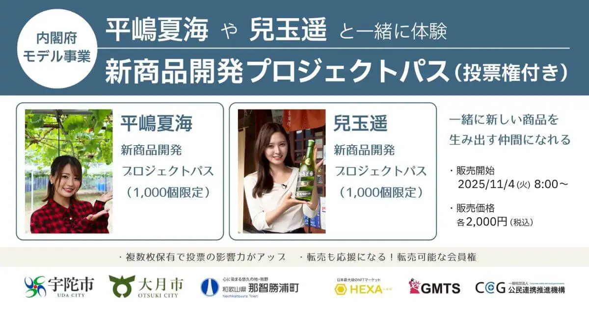 日本最大のNFTマーケット「HEXA (ヘキサ)」を運営するメディアエクイティ株式会社は、自治体と連携する株式会社GMTS、奈良県宇陀市、山梨県大月市、和歌山県などと、平嶋夏海の新商品プロジェクトパス、兒玉遥の新商品開発プロジェクトパスの2種をNFTとして発売開始したことを発表しました。