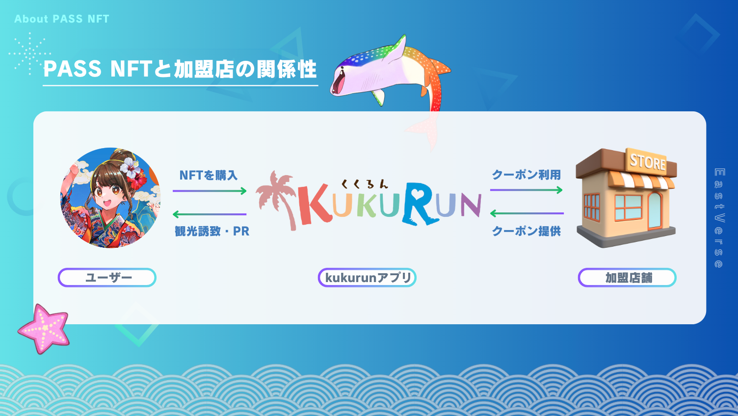 このPASS NFT保有者は自身の持つNFTを専⽤アプリで認証することで、沖縄県内のNFT加盟店が発⾏する様々なクーポンをNFT保有特典として利⽤可能となります。