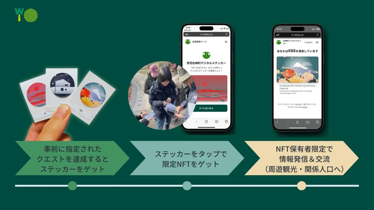 今回、静岡県松崎町では、旅後においてMeTagをフックとし、地域に訪問しNFTを獲得した人だけが閲覧可能な「情報提供や交流の場」を創出することで、周遊観光を起点とした松崎町への再来訪意欲の向上や関係人口創出の導線の創出を試みます。