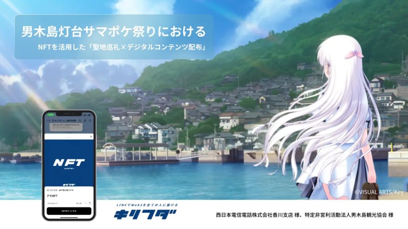 シンシズモ株式会社(本社:東京都港区、代表取締役社長:赤川 英之、以下、「シンシズモ」)は、西日本電信電話株式会社香川支店(香川支店長:徳永久雄、以下「NTT西日本」)と特定非営利活動法人男木島観光協会(会長:宮下淳、以下「男木島観光協会」)が7月25日(木)より開催する「第三回男木島灯台サマポケ祭り」(主催:男木島観光協会)において、NFTを用いたレベニューシェア型地域活性モデルの実証実験における企画支援・技術提供をいたしました。IPコンテンツを通して地域との接点を獲得することで、地域との継続的な関係人口の創出を実現します。
