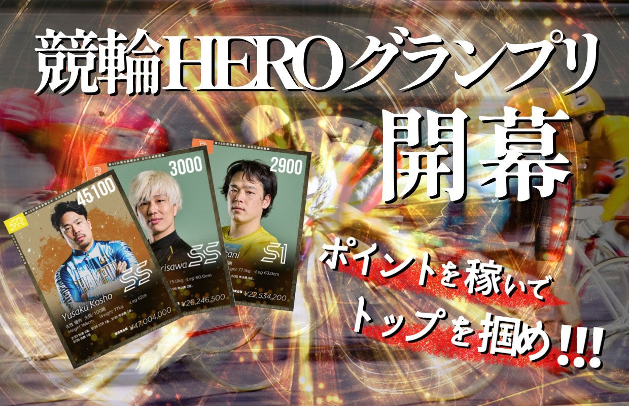 年末の「KEIRINグランプリ2023立川」へ挑むトップ競輪選⼿たちの感動の戦いをデジタルカードとしてコレクションしていただくための企画です。1分程度で会員登録(無料)が可能で、発⾏される「HEROチケット」でガチャを引いて、「HEROカード」とポイントを集めていきます。なお、「HEROチケット」は、会員登録時、新シリーズ開始時などに⾃動配布されます。