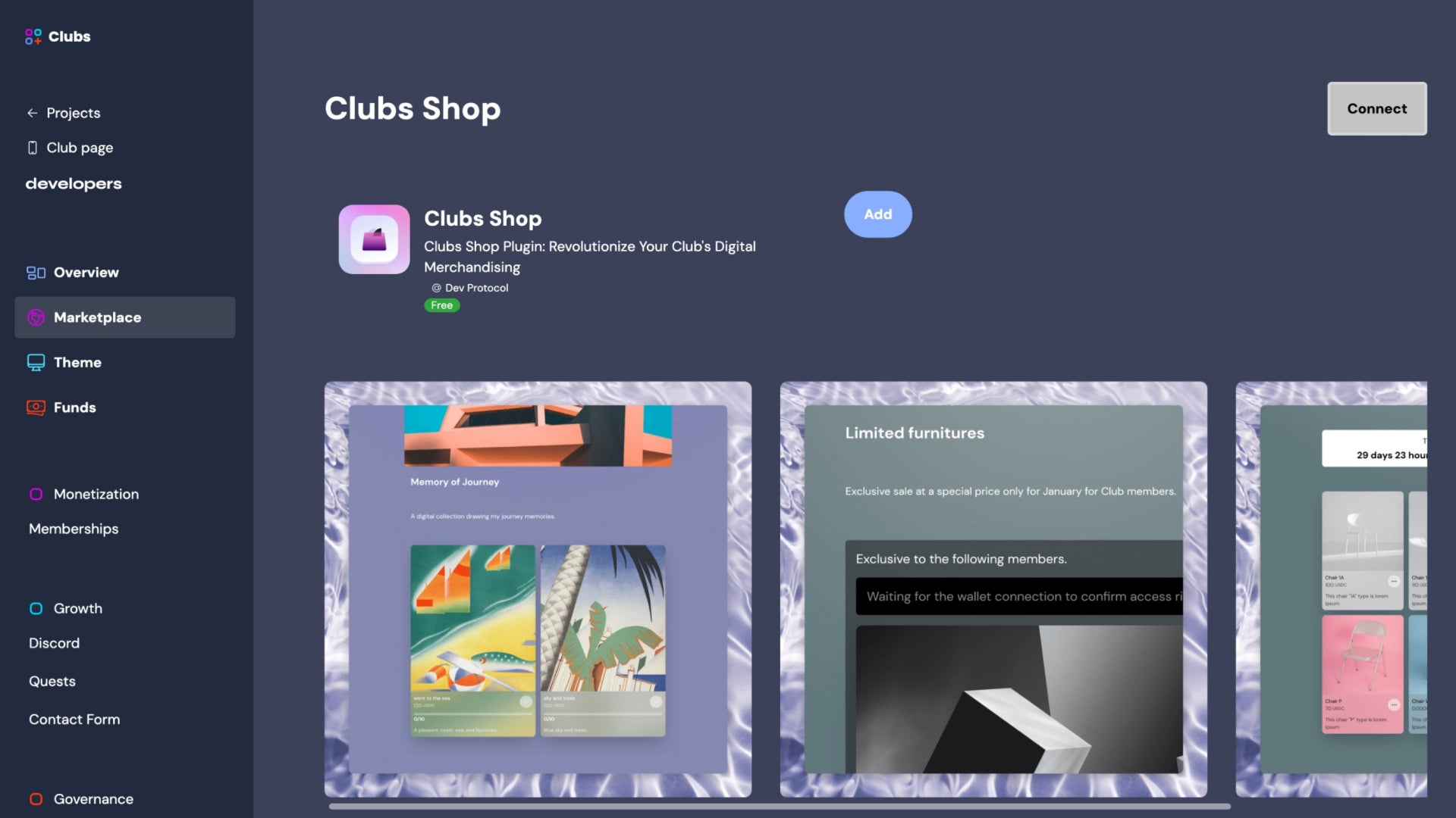 マーケットプレイスページ:https://developers.clubs.place/admin/marketplace/devprotocol:clubs:collections