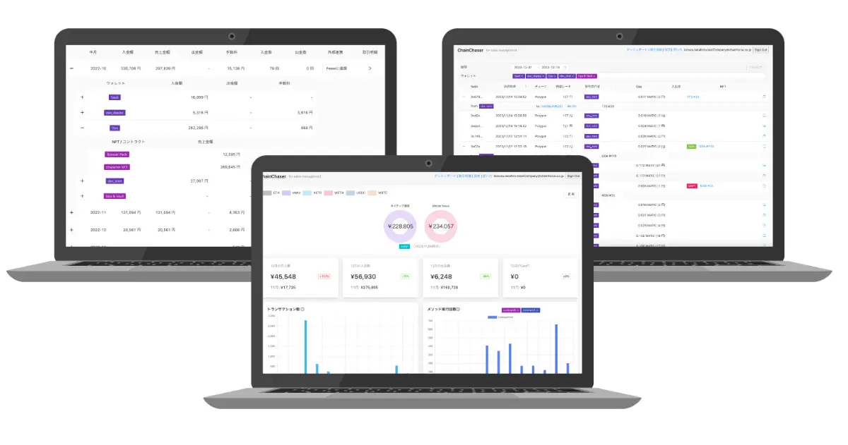NFT の売上やウォレットへの入出金、Gas 代、トランザクション数などを月単位で集計し表示します。