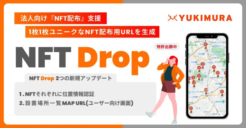 この記事では、株式会社YUKIMURAより【位置情報によるNFT配布支援】特許出願中!格安爆速で納品!法人向けNFT配布支援パッケージ『NFT Drop』は、各NFTの位置情報認証設定とユーザー向けMAP画面の追加オプション納品を提供開始することが発表されました。以下、プレスリリース詳細を掲載しております。