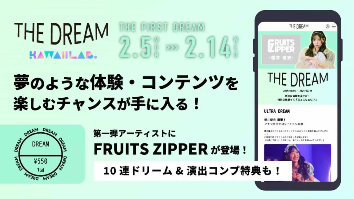 第一弾アーティストとして、アソビシステムが運営する日本のアイドル文化を世界へ発信するプロジェクト「KAWAII LAB.」から、昨年のレコード大賞にて最優秀新人賞を獲得し、2024年5月には日本武道館にてグループ結成2周年を記念するワンマンライブの2Days公演を開催予定の「FRUITS ZIPPER」が登場。2月21日にSportify O-EASTで開催される櫻井優衣の生誕祭を記念した体験型プロダクトを販売いたします。
